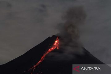 Guguran lava pijar Gunung Merapi terlihat dari Turi, Sleman, DI Yogyakarta, Minggu (26/3/2023). Berdasarkan data BPPTKG periode pengamatan 26 Maret 2023 pukul 00.00 - 06.00 WIB telah terjadi 12 kali guguran lava pijar dengan dengan jarak luncur maksimal 1.700 meter ke arah barat daya. ANTARA FOTO/Hendra Nurdiyansyah/aww.