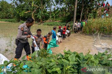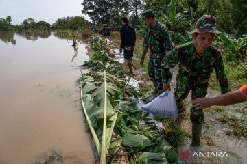 Warga bersama relawan BPBD Kabupaten Demak, dan anggota TNI-Polri bergotong royong menambal tanggul Sungai Tuntang di Kebonagung, Demak, Jawa Tengah, Rabu (29/3/2023). Penambalan tanggul dengan karung berisi pasir di tanggul sungai tersebut sebagai upaya mengantisipasi ancaman jebolnya tanggul yang mulai bocor dan kritis akibat meningkatnya debit air kiriman dari hulu wilayah Salatiga-Kabupaten Semarang yang mengancam permukiman, areal persawahan serta jalur tengah Semarang-Grobogan. ANTARA FOTO/Aji Styawan/aww.