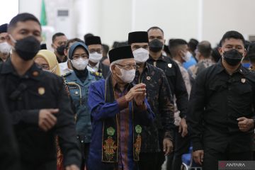 Wakil Presiden Maruf Amin (tengah) menyapa mahasiswa usai menerima piagam gelar Bapak Ekonomi Syariah dari Universitas Islam Negeri (UIN) Ar-Raniry di Gedung Auditorium Ali Hasjmi, Banda Aceh, Aceh, Kamis (30/3/2023). Kunjungan kerja tersebut dalam rangka meluncurkan buku berjudul KH Ma aruf Amin Bapak Ekonomi Syariah Indonesia sekaligus mengisi kuliah umum dan menerima gelar Bapak Ekonomi Syariah dari UIN Ar-Raniry Banda Aceh. ANTARA FOTO/Khalis Surry/hp.