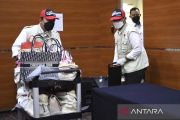Penyidik KPK membawa barang bukti dari tersangka kasus gratifikasi Rafael Alun Trisambodo saat konferensi pers di Gedung Merah Putih KPK, Jakarta, Senin (3/4/2023). KPK menahan mantan pejabat Ditjen Pajak Kementerian Keuangan Rafael Alun Trisambodo terkait kasus gratifikasi dengan mengamankan barang bukti berupa kotak deposit berisi mata uang asing dan tas bermerek. ANTARA FOTO/M Risyal Hidayat/aww.
