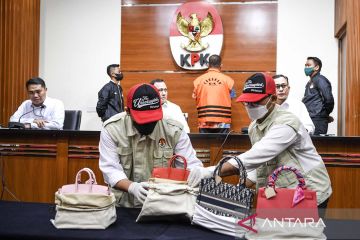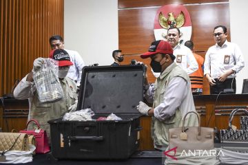Penyidik KPK menunjukkan barang bukti dari tersangka kasus gratifikasi Rafael Alun Trisambodo saat konferensi pers di Gedung Merah Putih KPK, Jakarta, Senin (3/4/2023). KPK menahan mantan pejabat Ditjen Pajak Kementerian Keuangan Rafael Alun Trisambodo terkait kasus gratifikasi dengan mengamankan barang bukti berupa kotak deposit berisi mata uang asing dan tas bermerek. ANTARA FOTO/M Risyal Hidayat/aww.