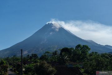 Gunung Merapi dipotret dari kawasan Tunggularum, Turi, Sleman, D.I Yogyakarta, Rabu (5/4/2023). Menurut data BPPTKG periode pengamatan 5 April 2023 pukul 06.00 - 12.00WIB Gunung Merapi teramati mengalami 3 kali guguran lava dengan jarak luncur maksimum 1500 meter ke arah Kali Bebeng dan Boyong. ANTARA FOTO/Andreas Fitri Atmoko/foc.