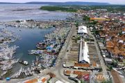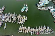 Foto udara kapal nelayan di Dermaga Pelabuhan Ikan Muncar, Banyuwangi, Jawa Timur, Rabu (5/4/2023). Kementerian Kelautan dan Perikanan (KKP) mewajibkan kapal yang memegang izin operasi dari kementerian atau pemerintah daerah mengaktifkan Sistem Pemantauan Kapal Perikanan (SPKP) dengan tujuan pengelolaan perikanan Negara Republik Indonesia (WPPNRI) terpantau dengan baik sesuai PP Nomor 11 Tahun 2023. ANTARA FOTO/Budi Candra Setya/nym.