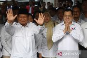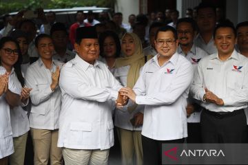 Ketua Umum Partai Gerindra Prabowo Subianto (kiri) bersama Ketua Umum Partai Perindo Hary Tanoesoedibjo (kanan) memberikan salam usai pertemuan tertutup di Jakarta, Rabu (5/4/2023). Pertemuan itu membahas peluang koalisi antara kedua partai menjelang pemilu dan pilpres 2024. ANTARA FOTO/Akbar Nugroho Gumay/nym.