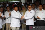 Ketua Umum Partai Gerindra Prabowo Subianto (kiri) berjabat tangan dengan Ketua Umum Partai Perindo Hary Tanoesoedibjo (kanan) usai pertemuan tertutup di Jakarta, Rabu (5/4/2023). Pertemuan itu membahas peluang koalisi antara kedua partai menjelang pemilu dan pilpres 2024. ANTARA FOTO/Akbar Nugroho Gumay/nym.
