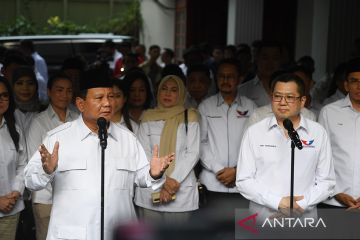 Ketua Umum Partai Gerindra Prabowo Subianto (kiri) memberikan keterangan disaksikan Ketua Umum Partai Perindo Hary Tanoesoedibjo (kanan) usai pertemuan tertutup di Jakarta, Rabu (5/4/2023). Pertemuan itu membahas peluang koalisi antara kedua partai menjelang pemilu dan pilpres 2024. ANTARA FOTO/Akbar Nugroho Gumay/nym.
