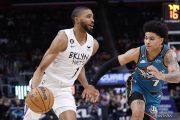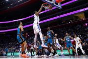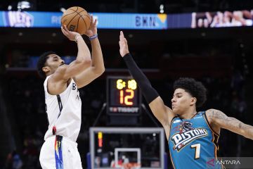 Pebasket Brooklyn Nets Nic Claxton (kedua kiri) memasukkan bola dengan dunk saat bertanding melawan Detroit Pistons, dalam laga lanjutan NBA di Little Caesars Arena, Detroit, Michigan, Amerika Serikat, Rabu (5/4/2023). Brooklyn Nets berhasil mengalahkan Detroit Pistons 123-108. ANTARA FOTO/Reuters- Credit: Rick Osentoski-USA TODAY Sports/hp.
