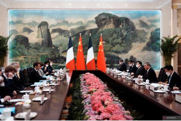 Presiden Prancis Emmanuel Macron (tengah) tiba untuk melakukan pertemuan dengan Perdana Menteri China Li Qiang , di Great Hall of the People, Beijing, China, Kamis (6/4/2023). Presiden Prancis Emmanuel Macron tengah melakukan kunjungan resmi ke China selama tiga hari , 5-7 April 2023. ANTARA FOTO/Pool via Reuters- Thibault Camus/hp.