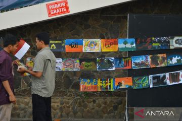 Panitia memajang karya Art Theraphy di halaman Masjid Mujahidin Padang, Sumatera Barat, Kamis (6/4/2023). Masjid Mujahidin Padang bersama komunitas Seni Dangau Studio membuka Art Therapy gratis bagi jemaah dan warga yang bermanfaat untuk mengurangi tekanan psikologis, mengurangi gejala trauma, dan menurunkan tingkat depresi. ANTARA FOTO/Iggoy el Fitra/aww.