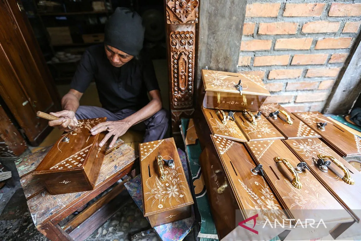 Perajin menyelesaikan ukiran pada kotak amal di Cemolex, Pasir Putih, Depok, Jawa Barat, Jumat (7/4/2023). Menurut perajin di bulan Ramadhan permintaan kotak amal ukir tersebut meningkat dari 50 kotak amal menjadi 100 kotak amal per hari dengan harga Rp100 ribu hingga Rp150 ribu per kotak tergantung ukuran dan model. ANTARA FOTO/Asprilla Dwi Adha/rwa.