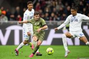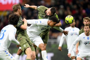 Pesepak bola AC Milan Olivier Giroud (keempat kiri) mencetak gol ke gawang Empoli yang kemudian di batalkan oleh wasit dalam laga lanjutan Liga Italia, di Stadion San Siro, Milan, Italia, Jumat (7/4/2023). Empoli menahan AC Milan tanpa gol 0-0. ANTARA FOTO/Reuters-Daniele Mascolo/hp.