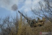Anggota layanan Ukraina mengendarai howitzer self-propelled saat serangan Rusia di Ukraina berlanjut, di dekat garis depan kota Bakhmut, Ukraina, Jumat (7/4/2023). ANTARA FOTO/Oleksandr Klymenko/hp.