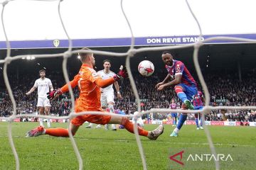 Pemain Crystal Palace Jordan Ayew mencetak gol kelima ke gawang Leeds United yang dijaga Illan Meslier pada pertandingan Liga Inggris di Elland Road, Leeds, Inggris (9/4/2023). Crystal Palace menang besar 5-1 lawan Leeds United. ANTARA FOTO/REUTERS/Carl Recine/aww.
