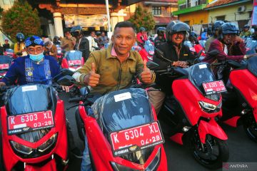 Sejumlah Kepala Desa naik motor dinas baru saat pembagian di kantor Kabupaten Jepara, Jawa Tengah, Senin (10/4/2023). Pemerintah setempat membagikan sebanyak 184 motor dinas baru untuk menunjang kinerja pelayanan masyarakat di tingkat desa dengan total anggaran Rp5,8 milliar. ANTARA FOTO/Yusuf Nugroho/foc.