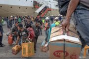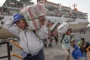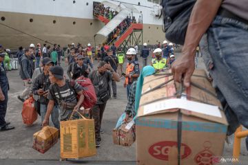 Sejumlah penumpang Kapal Motor (KM) Lawit asal Pontianak, Kalimantan barat membawa barang bawaan mereka setibanya di dermaga penumpang Pelabuhan Tanjung Emas, Semarang, Jawa Tengah, Selasa (11/4/2023). PT Pelayaran Nasional Indonesia (Persero) secara nasional memprediksi penumpang kapal yang menggunakan kapal PT PELNI pada periode masa angkutan Lebaran 2023 akan mencapai 604.183 orang, atau melonjak sekitar 25 persen dibandingkan jumlah realisasi penumpang pada periode yang sama pada tahun 2022. ANTARA FOTO/Aji Styawan/hp.