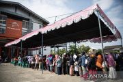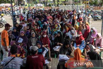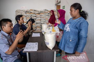 Warga dari Keluarga Penerima Manfaat (KPM) antre menunggu giliran untuk didata oleh petugas saat penyaluran bantuan cadangan beras pemerintah di Kantor Pos Tanjung Api-Api Palembang, Sumatera Selatan, Rabu (12/4/2023). Perum Bulog Kanwil Sumatera Selatan-Bangka Belitung bersama PT Pos Indonesia setempat menyalurkan 6.171 ton beras medium untuk 617.121 orang penerima bantuan pangan atau rumah tangga yang berpenghasilan rendah di Provinsi Sumatera Selatan dan Bangka Belitung untuk program bantuan pangan pemerintah periode Maret, April dan Mei 2023. ANTARA FOTO/Nova Wahyudi/nym.