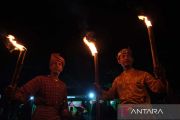 Dua warga membawa obor saat mengikuti pawai keriang bandong (lampion) di Pontianak, Kalimantan Barat, Rabu (12/4/2023). Pawai keriang bandong dan obor yang digelar masyarakat Pontianak Barat tersebut untuk menyemarakkan bulan Ramadhan 1444 Hijriah dan melestarikan tradisi budaya Melayu setempat. ANTARA FOTO/Jessica Helena Wuysang/aww.