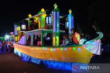 Sejumlah warga menaiki mobil yang dihiasi dengan keriang bandong (lampion) berbentuk masjid saat pawai keriang bandong di Pontianak, Kalimantan Barat, Rabu (12/4/2023). Pawai keriang bandong dan obor yang digelar masyarakat Pontianak Barat tersebut untuk menyemarakkan bulan Ramadhan 1444 Hijriah dan melestarikan tradisi budaya Melayu setempat. ANTARA FOTO/Jessica Helena Wuysang/aww.