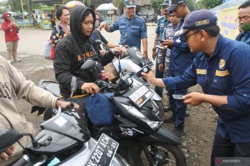 Petugas memindai kode batang/barcode sepeda motor calon penumpang sebelum menuju dermaga kapal feri dalam mudik bareng gratis 2023 di Pelabuhan Jangkar, Situbondo, Jawa Timur, Kamis (13/4/2023). Pemerintah Provinsi Jawa Timur menyediakan layanan mudik bareng gratis menggunakan kapal laut menuju Pulau Raas, Sumenep guna membantu warga pulang ke kampung halaman untuk merayakan Idul Fitri 1444 Hijriah. ANTARA FOTO/Seno/foc.