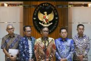 Menteri Koordinator Bidang Politik Hukum dan Keamanan Mahfud MD (tengah) memberikan keterangan pers terkait RUU Perampasan Aset Hasil Tindak Pidana di Jakarta, Jumat (14/4/2023). Mahfud menjelaskan bahwa pemerintah telah menyelesaikan naskah substantif draf Rancangan Undang-Undang (RUU) tentang Perampasan Aset Hasil Tindak Pidana dan akan segera dikirimkan ke DPR. ANTARA FOTO/Rivan Awal Lingga/hp.