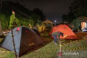Relawan menyiapkan tenda saat pembukaan posko mudik bertema perkemahan di Posko Mudik Gombel, Jalan Setiabudi, Bukit Gombel, Semarang, Jawa Tengah, Sabtu (15/4/2023). Posko mudik yang dibuka komunitas relawan gabungan dari pendaki, pecinta alam, kemanusiaan dan kebencanaan itu menyediakan sejumlah fasilitas gratis diantaranya yaitu tempat istirahat sementara maupun menginap di tenda, posko kesehatan, bengkel, toilet, serta dapur umum, untuk melayani pemudik yang melintas ke sejumlah wilayah di Jawa Tengah pada masa mudik H-7 hingga H-1 Lebaran. ANTARA FOTO/Aji Styawan/aww.