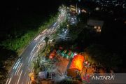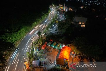 Foto udara suasana posko mudik bertema perkemahan saat pembukaannya di Posko Mudik Gombel, Jalan Setiabudi, Bukit Gombel, Semarang, Jawa Tengah, Sabtu (15/4/2023). Posko mudik yang dibuka komunitas relawan gabungan dari pendaki, pecinta alam, kemanusiaan dan kebencanaan itu menyediakan sejumlah fasilitas gratis diantaranya yaitu tempat istirahat sementara maupun menginap di tenda, posko kesehatan, bengkel, toilet, serta dapur umum, untuk melayani pemudik yang melintas ke sejumlah wilayah di Jawa Tengah pada masa mudik H-7 hingga H-1 Lebaran. ANTARA FOTO/Aji Styawan/aww.
