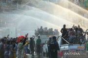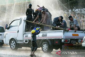Sejumlah orang menyemprotkan air saat merayakan festival air di Yangon, Myanmar, Sabtu (15/4/2023). ANTARA FOTO/Xinhua/Myo Kyaw Soe/rwa.