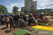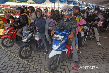 Sejumlah pengguna sepeda motor yang akan menyeberang ke Pulau Sumatera antre masuk ke kapal feri di Pelabuhan Ciwandan, Cilegon, Banten, Minggu (16/4/2023). Arus pemudik bersepeda motor tujuan Pulau Sumatera tahun ini terpantau lebih lancar karena dilayani secara khusus di jalur penyeberangan Ciwandan yang terpisah dari jalur roda empat. ANTARA FOTO/Asep Fathulrahman/tom.