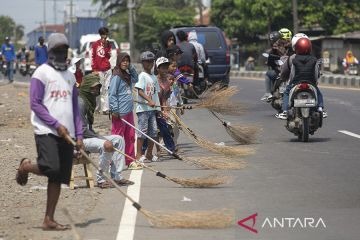 Sejumlah warga berebut mengambil uang sedekah dari pengendara yang melintas di Jembatan Sewo, Jalur Pantura Sukra Indramayu, Jawa Barat, Senin (17/4/2023). Aksi mengambil uang sedekah menggunakan sapu tersebut dapat membahayakan keselamatan pengguna jalan terutama saat arus mudik. ANTARA FOTO/Dedhez Anggara/rwa.