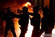 Polisi Prancis mengamankan unjuk rasa warga yang merespon pidato Presiden Emmanuel Macron terkait penetapan usia pensiun di Paris, Prancis, Senin (17/4/2023). ANTARA FOTO/REUTERS/Stephanie Lecocq/foc.
