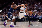Pebasket Minnesota Timberwolves Karl-Anthony Towns (32) menggiring bola yang dihadang pebasket Denver Nuggets Jeff Green (32) dalam pertandingan Playoffs NBA di Ball Arena, Denver, Colorado, Amerika Serikat, Kamis (20/4/2023). Denver Nuggets berhasil mengalahkan Minnesota Timberwolves 122-113. ANTARA FOTO/USA TODAY Sports via Reuters/Isaiah J. Downing/nym.