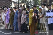 Warga berjabat tangan usai melaksanakan Shalat Idul Fitri di Desa Darmaraja, Kabupaten Ciamis, Jawa Barat, Sabtu (22/4/2023). Tradisi bersalaman massal Lebaran antardusun tersebut dilaksanakan pada perayaan Idul Fitri 1444 H dengan tujuan untuk saling memaafkan dan menjaga tali silaturahim serta memperkokoh kerukunan antarumat beragama. ANTARA FOTO/Adeng Bustomi/nym.
