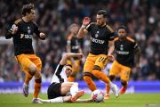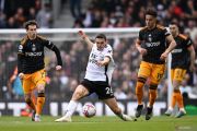 Pesepak bola Fulham Joao Palhinha i(tengah) membawa bola dan dihadang pesepak bola Leeds United Brenden Aaronson dan Rodrigo dalam laga lanjutan Liga Inggris, di Stadion Craven Cottage, London, Inggris, Sabtu (22/4/2023). ANTARA FOTO/Reuters-Dylan Martinez /hp.