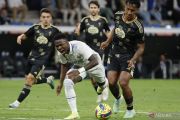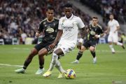 Pesepak bola Real Madrid Vinicius Junior (depan) berupaya melewati penjagaan pesepak bola Celta Vigo Renato Tapia dalam laga lanjutan Liga Italia, di Stadion Santiago Bernabeu, Madrid, Spanyol, Sabtu (22/4/2023). Real Madrid berhasil mengalahkan Celta Vigo 2-0. ANTARA FOTO/Reuters-Juan Medina/hp.