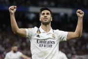 Pesepak bola Real Madrid Marco Asensio melakukan selebrasi setelah berhasil mencetak gol ke gawang Celta Vigo dalam laga lanjutan Liga Italia, di Stadion Santiago Bernabeu, Madrid, Spanyol, Sabtu (22/4/2023). Real Madrid berhasil mengalahkan Celta Vigo 2-0. ANTARA FOTO/Reuters-Juan Medina/hp.