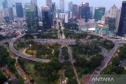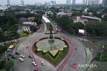 Foto udara suasana lalu lintas di kawasan Bundaran HI, Jakarta, Minggu (23/4/2023). Berdasarkan data Jasa Marga, sebanyak 500 ribu kendaraan meninggalkan wilayah Jabodetabek menuju ke sejumlah daerah pada arus mudik 2023 sehingga pada hari kedua Lebaran 1444 H sejumlah ruas jalan di Ibu Kota terpantau lengang dari hari biasanya. ANTARA FOTO/Indrianto Eko Suwarso/aww.