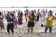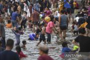 Pengunjung bermain pasir di kawasan pantai Ancol, Jakarta, Minggu (23/4/2023). Menurut data dari PT Pembangunan Jaya Ancol Tbk, pada hari kedua Idul Fitri 1444 Hijriyah jumlah kunjungan wisatawan ke objek wisata itu mencapai 97 ribu orang hingga pukul 18.00 WIB. ANTARA FOTO/M Risyal Hidayat/aww.