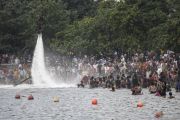 Sejumlah pengunjung berjoget di kawasan pantai Ancol, Jakarta, Minggu (23/4/2023). Menurut data dari PT Pembangunan Jaya Ancol Tbk, pada hari kedua Idul Fitri 1444 Hijriyah jumlah kunjungan wisatawan ke objek wisata itu mencapai 97 ribu orang hingga pukul 18.00 WIB. ANTARA FOTO/M Risyal Hidayat/aww.