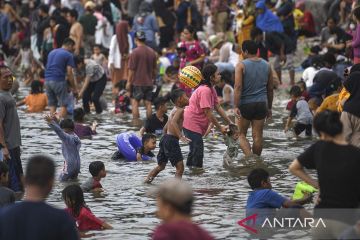 Sejumlah pengunjung bermain di kawasan pantai Ancol, Jakarta, Minggu (23/4/2023). Menurut data dari PT Pembangunan Jaya Ancol Tbk, pada hari kedua Idul Fitri 1444 Hijriah jumlah kunjungan wisatawan ke objek wisata itu mencapai 97 ribu orang hingga pukul 18.00 WIB. ANTARA FOTO/M Risyal Hidayat/aww.