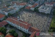 Foto udara wisatawan menikmati suasana Taman Fatahillah di Kota Tua, Jakarta, Senin (24/4/2023). Pada H+2 Hari Raya Idul Fitri kawasan cagar budaya yang dibangun pada abad-17 oleh pemerintah kolonial Belanda tersebut dipadati wisatawan dari Jakarta maupun daerah-daerah lain di sekitarnya. ANTARA FOTO/Aditya Pradana Putra/nym.