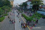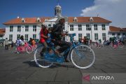 Wisatawan bersepeda di Taman Fatahillah, Kota Tua, Jakarta, Senin (24/4/2023). Pada H+2 Hari Raya Idul Fitri kawasan cagar budaya yang dibangun pada abad-17 oleh pemerintah kolonial Belanda tersebut dipadati wisatawan dari Jakarta maupun daerah-daerah lain di sekitarnya. ANTARA FOTO/Aditya Pradana Putra/nym.