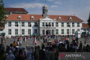 Sejumlah wisatawan menikmati suasana Taman Fatahillah di Kota Tua, Jakarta, Senin (24/4/2023). Pada H+2 Hari Raya Idul Fitri kawasan cagar budaya yang dibangun pada abad-17 oleh pemerintah kolonial Belanda tersebut dipadati wisatawan dari Jakarta maupun daerah-daerah lain di sekitarnya. ANTARA FOTO/Aditya Pradana Putra/nym.