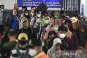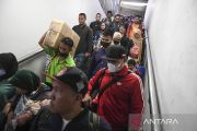 Penumpang kereta api Tawang Jaya tiba di Stasiun Pasar Senen, Jakarta, Senin (24/4/2023). Pada H+2 lebaran, sekitar 40.000 penumpang kereta api tiba di area KAI Daop 1 Jakarta atau mengalami peningkatan hingga 100 persen dari masa normal. ANTARA FOTO/Hafidz Mubarak A/nym.