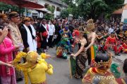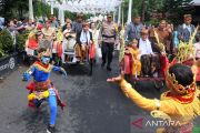 Menteri Pariwisata dan Ekonomi Kreatif (Menparekraf) Sandiaga Uno (ketiga kiri) bersama Wali Kota Solo Gibran Rakabuming Raka (kedua kiri) dan Raja Keraton Mangkunegaran Solo KGPPA Mangkunegara X Bhre Cakrahutomo Wira Sudjiwo (kiri) menonton pertunjukan Solo Menari dari Ngarsopuro menuju Pasar Gede Solo, Jawa Tengah, Sabtu (29/4/2023). Pertunjukan Solo Menari digelar untuk merayakan Hari Tari Dunia. ANTARAFOTO/Maulana Surya/tom.