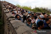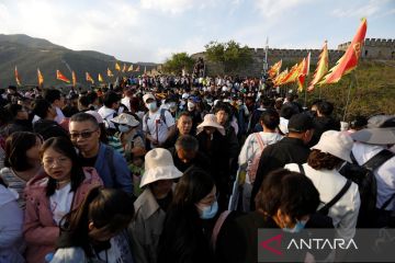 Pengunjung berjalan di sepanjang Tembok Besar bagian Mutianyu saat liburan Hari Buruh selama lima hari di Beijing, China (30/4/2023). ANTARA FOTO/REUTERS/Florence Lo/tom.