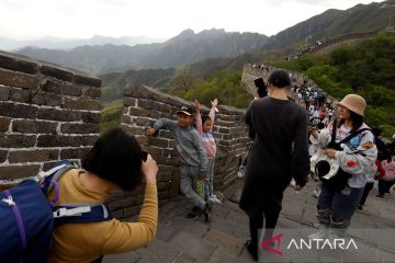 Anak-anak berfoto di Tembok Besar bagian Mutianyu saat liburan Hari Buruh di Beijing, China (30/4/2023). ANTARA FOTO/REUTERS/Florence Lo/tom.