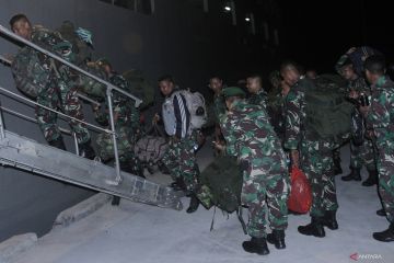 Sejumlah personel TNI Angkatan Darat (AD) menaiki KRI Banjarmasin 592 yang berlabuh di pelabuhan Tenau Kupang, NTT, Rabu (3/5/2023) malam. TNI AD mulai mempersiapkan sejumlah personelnya serta kendaraan pendukung untuk bertolak ke Labuan Bajo, Kabupaten Manggarai Barat guna mengamankan seluruh rangkaian pelaksanaan KTT ASEAN ke-42 yang puncaknya akan dilaksanakan pada 9-11 Mei. ANTARA FOTO/Kornelis Kaha/foc.