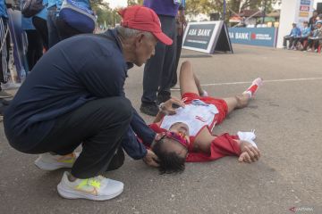 Atlet jalan cepat putra Indonesia Hendro Yap (kanan) menerima penanganan dari Pelatih jalan cepat Wita Witarsa (kiri) usai mencapai finis pertama pada lomba atletik nomor 20 kilometer jalan cepat Sea Games 2023 di kawasan situs warisan budaya dunia UNESCO Angkor Wat, Siem Reap, Kamboja, Sabtu (6/5/2023). Atlet jalan cepat asal Jawa Barat tersebut berhasil meraih medali emas. ANTARA FOTO/Muhammad Adimaja/hp.