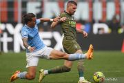 Pesepak bola Lazio Luca Pellegrini (kiri) berebut bola dengan pesepak bola AC Milan Ante Rebic dalam laga lanjutan Liga Italia, di Stadion San Siro, Milan, Italia, Sabtu (6/5/2023). AC MIlan berhasil mengalahkan Lazio 2-0. ANTARA FOTO/Reuters-Daniele Mascolo/hp.
