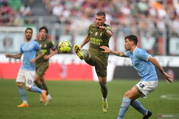 Pesepak bola AC Milan Ante Rebic (kedua kanan) berebut bola dengan pesepak bola Lazio Alessio Romagnoli dalam laga lanjutan Liga Italia, di Stadion San Siro, Milan, Italia, Sabtu (6/5/2023). AC MIlan berhasil mengalahkan Lazio 2-0. ANTARA FOTO/Reuters-Daniele Mascolo/hp.